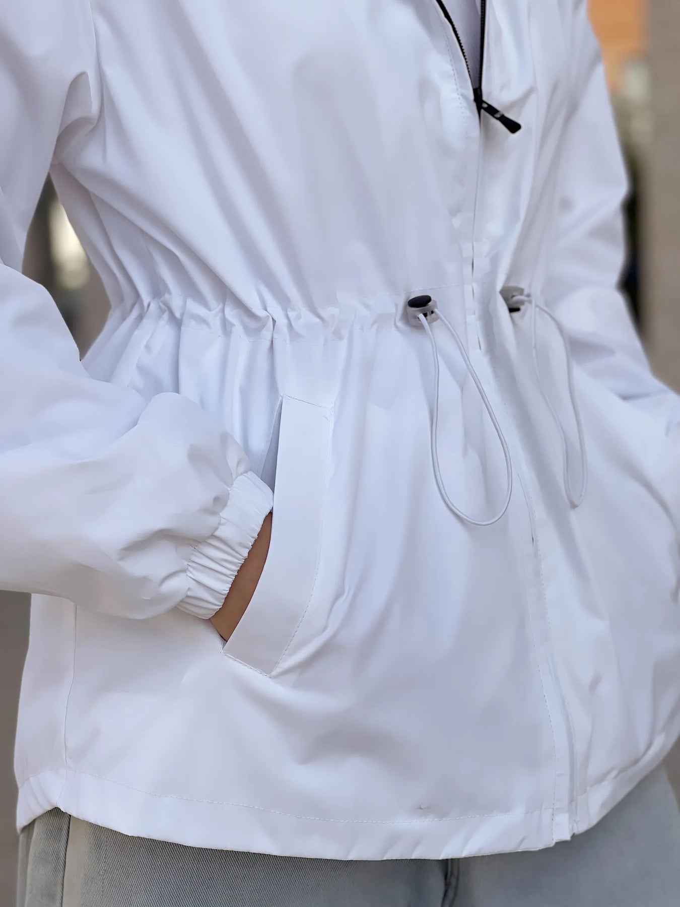 This lightweight straight-cut jacket is perfect for walks, sports, travel, and everyday wear. The adjustable drawstring at the waist allows for a customizable fit and highlights the figure.